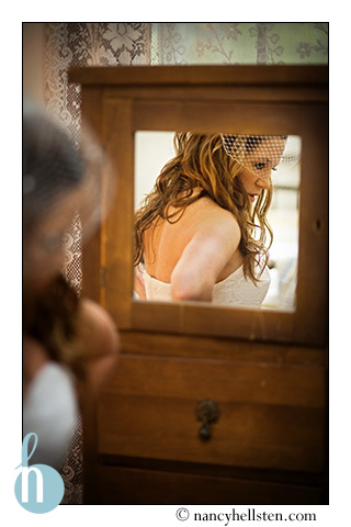 Nicole's battenburg lace dress, bird cage veil, and raffia-tied bouquet of loose spring flowers (decorated with a cameo that belonged to her late grandmother) were a perfect, vintage fit with the venue.